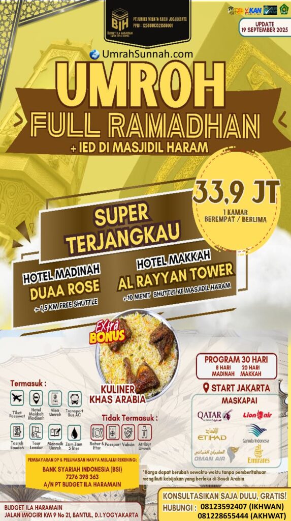 Bayangkan Ramadhan kali ini, setiap tarawih, setiap doa, setiap sujud dilakukan langsung di Masjidil Haram. Anda tidak hanya berpuasa, tapi juga memperbanyak amal ibadah di tempat paling mulia di muka bumi. Umroh Full Ramadhan bersama Budget Ila Haramain hadir dengan harga super terjangkau, hanya 33,9 juta. Jadikan Ramadhan ini berbeda dari sebelumnya.